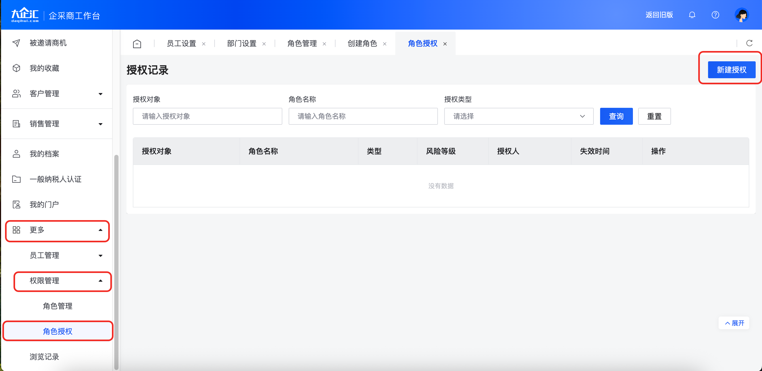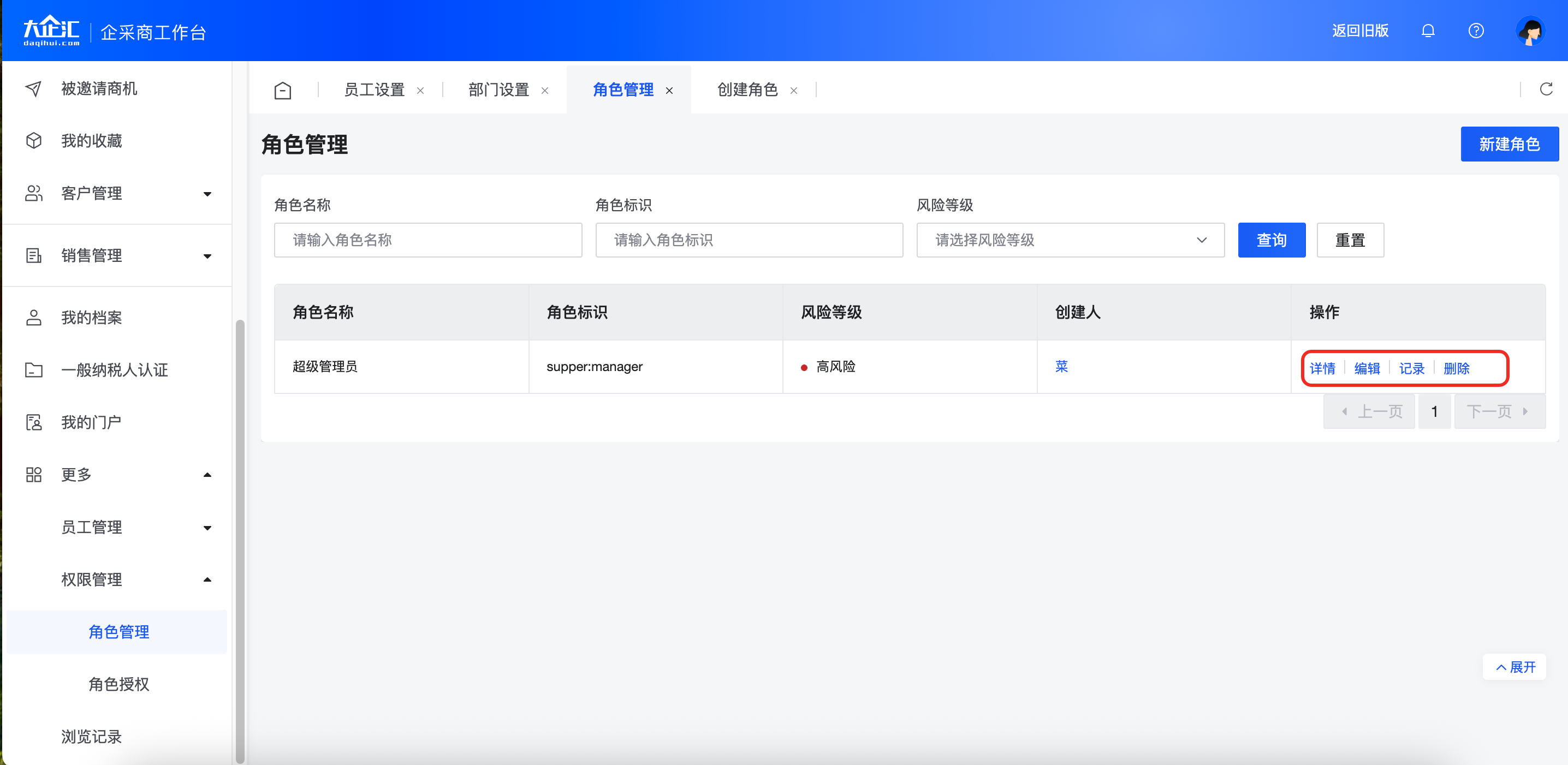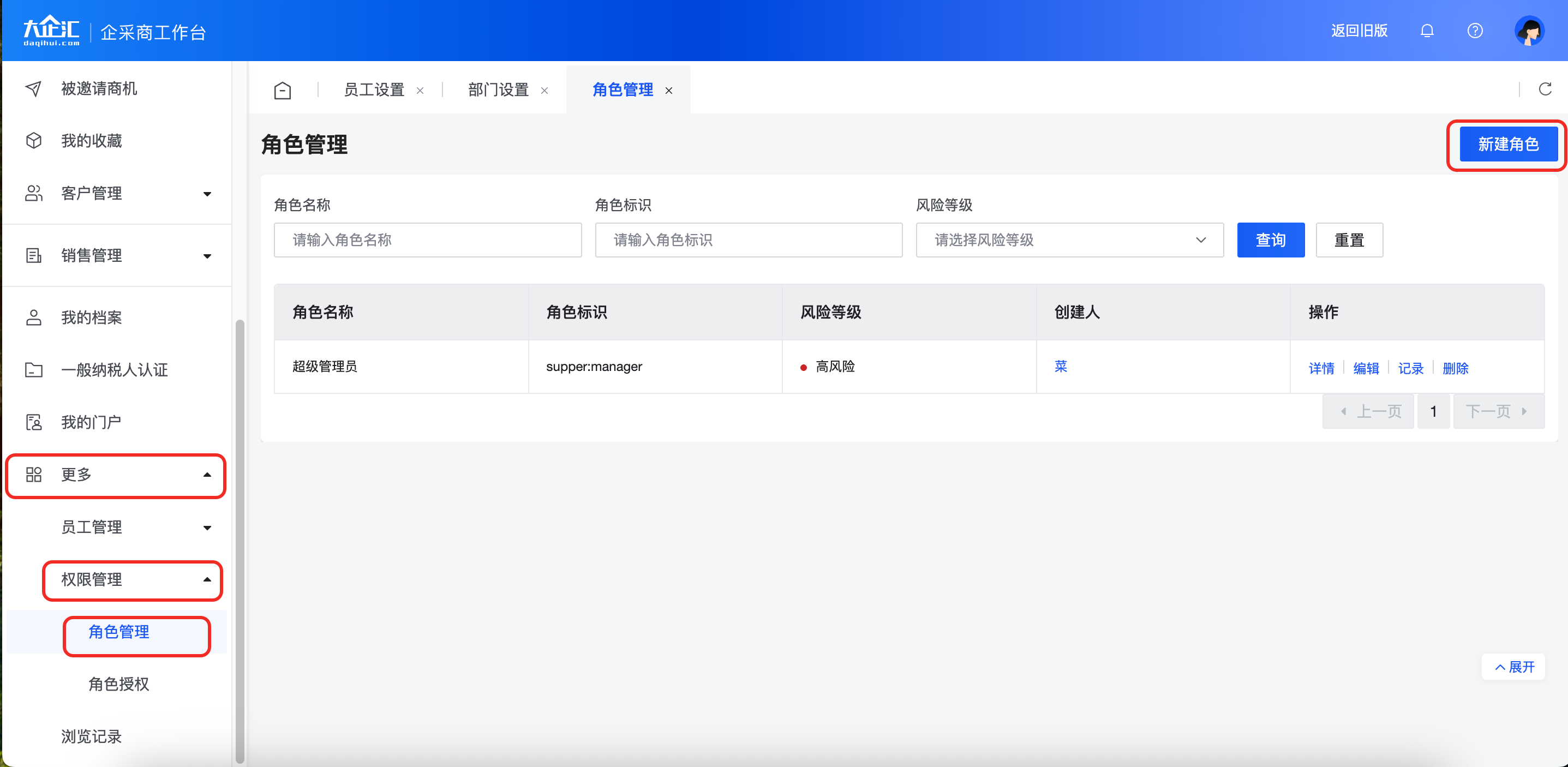 登录企采商工作台,点击【更多】-【权限管理】-【角色管理】。