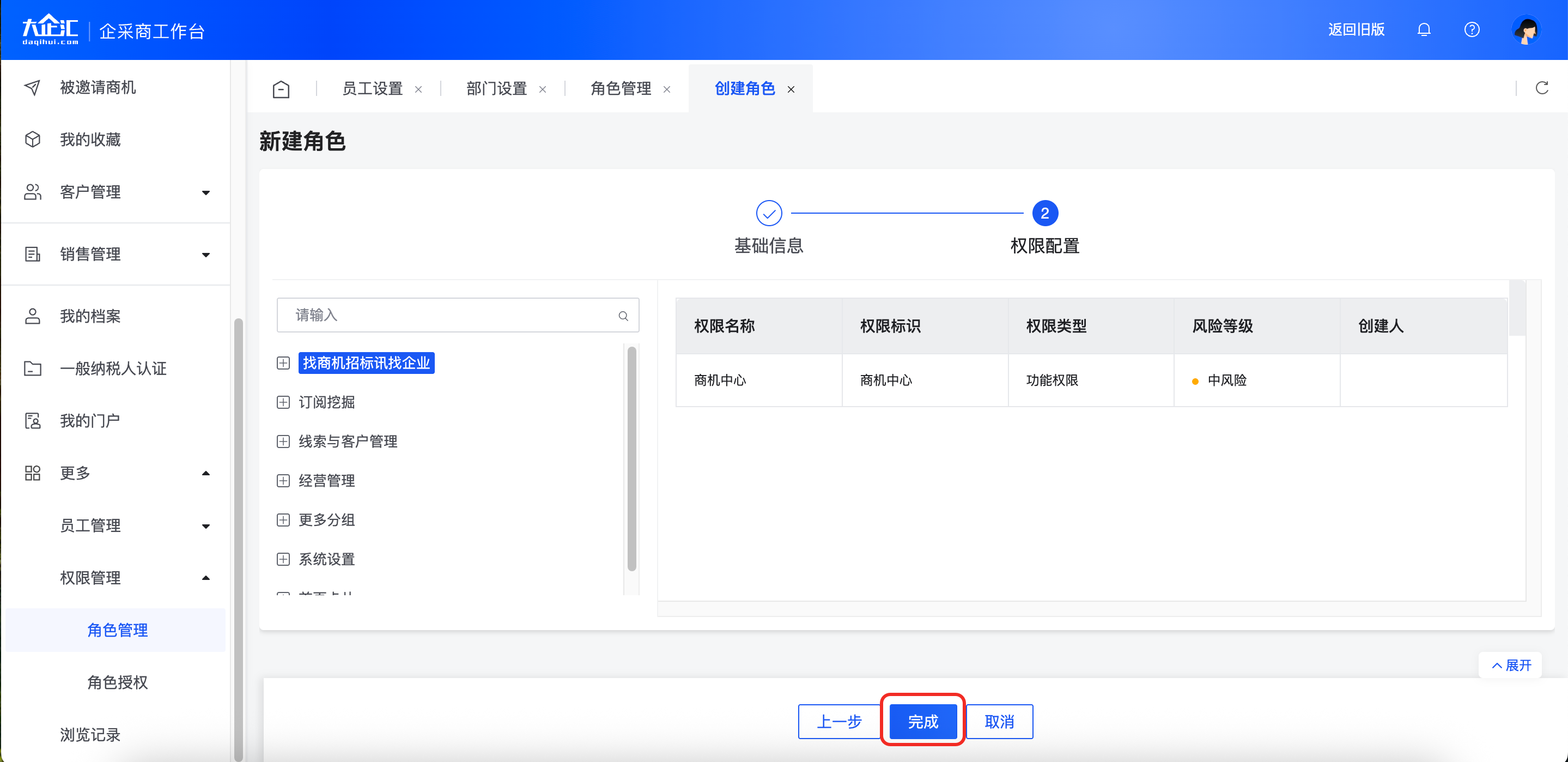 2)选择对应权限点,该权限点会体现在对应角色的工作台中,未配置的权限点则无法看到该菜单,点击【完成】则角色编辑成功。