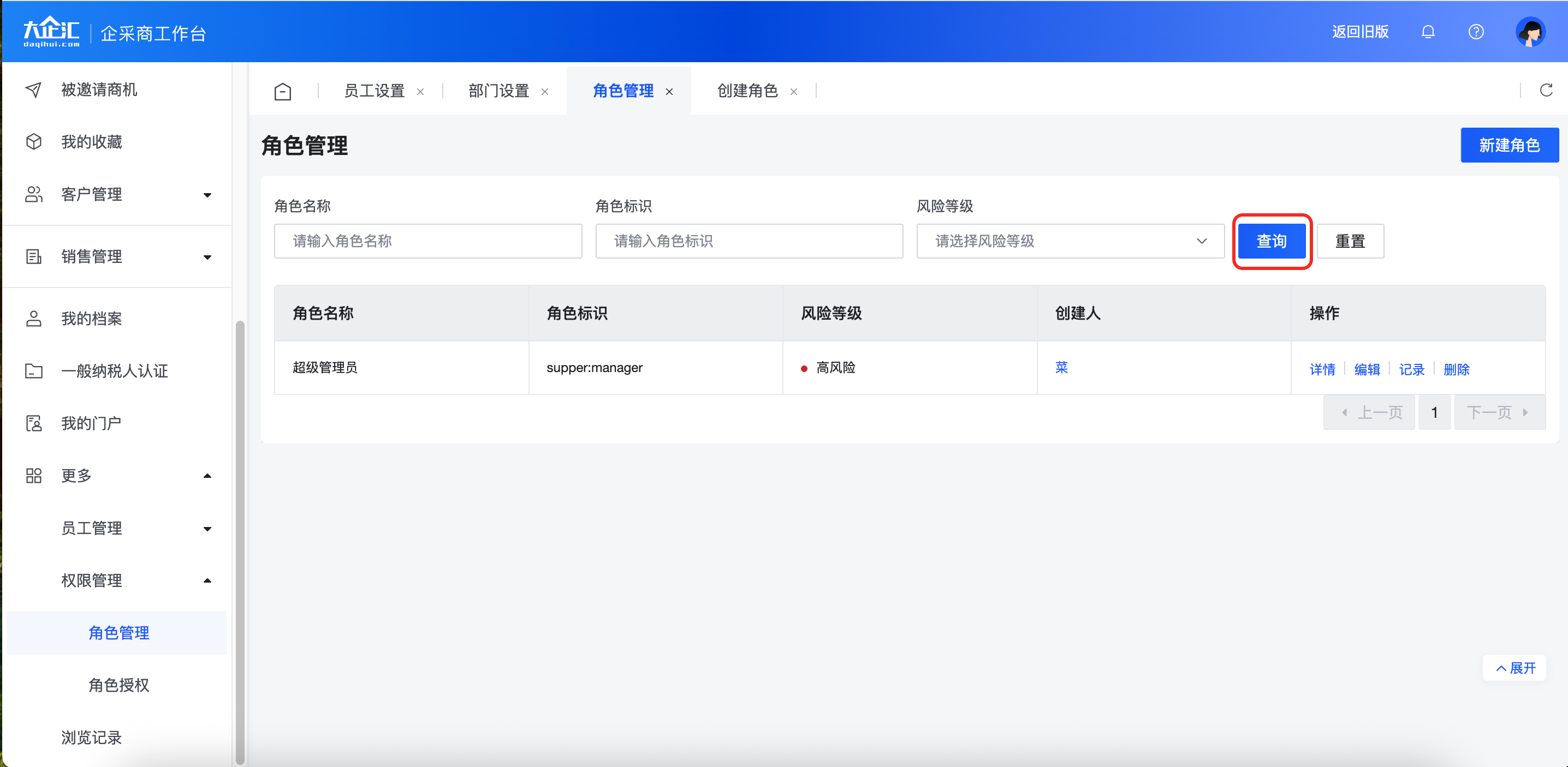 在角色管理页面的输入框中填写角色名称或者标识,点击【查询】可筛查到对应角色。