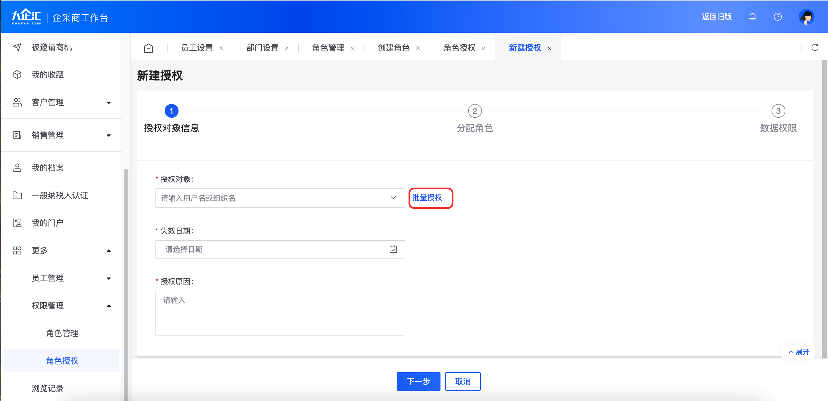 1)点击【更多】-【权限管理】-【角色授权】-【新建授权】填写授权对象信息点击【下一步】。