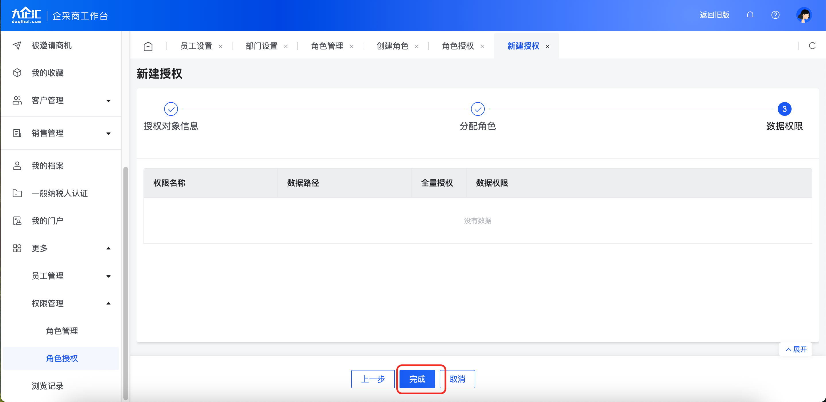 3)进行数据权限配置点击【完成】授权成功,页面跳转至“授权记录”页面。