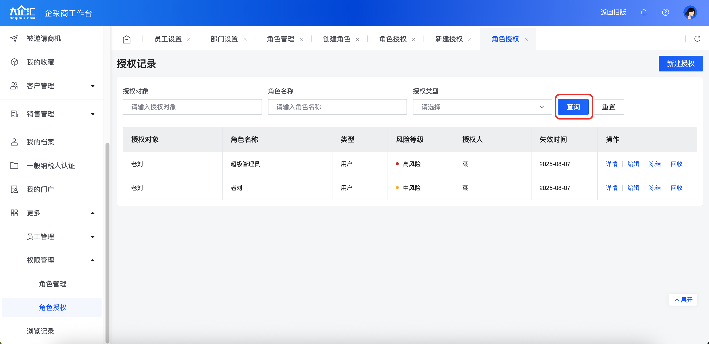 冻结:冻结后授权对象的权限暂时不能使用,点击【解冻】可以再次恢复权限