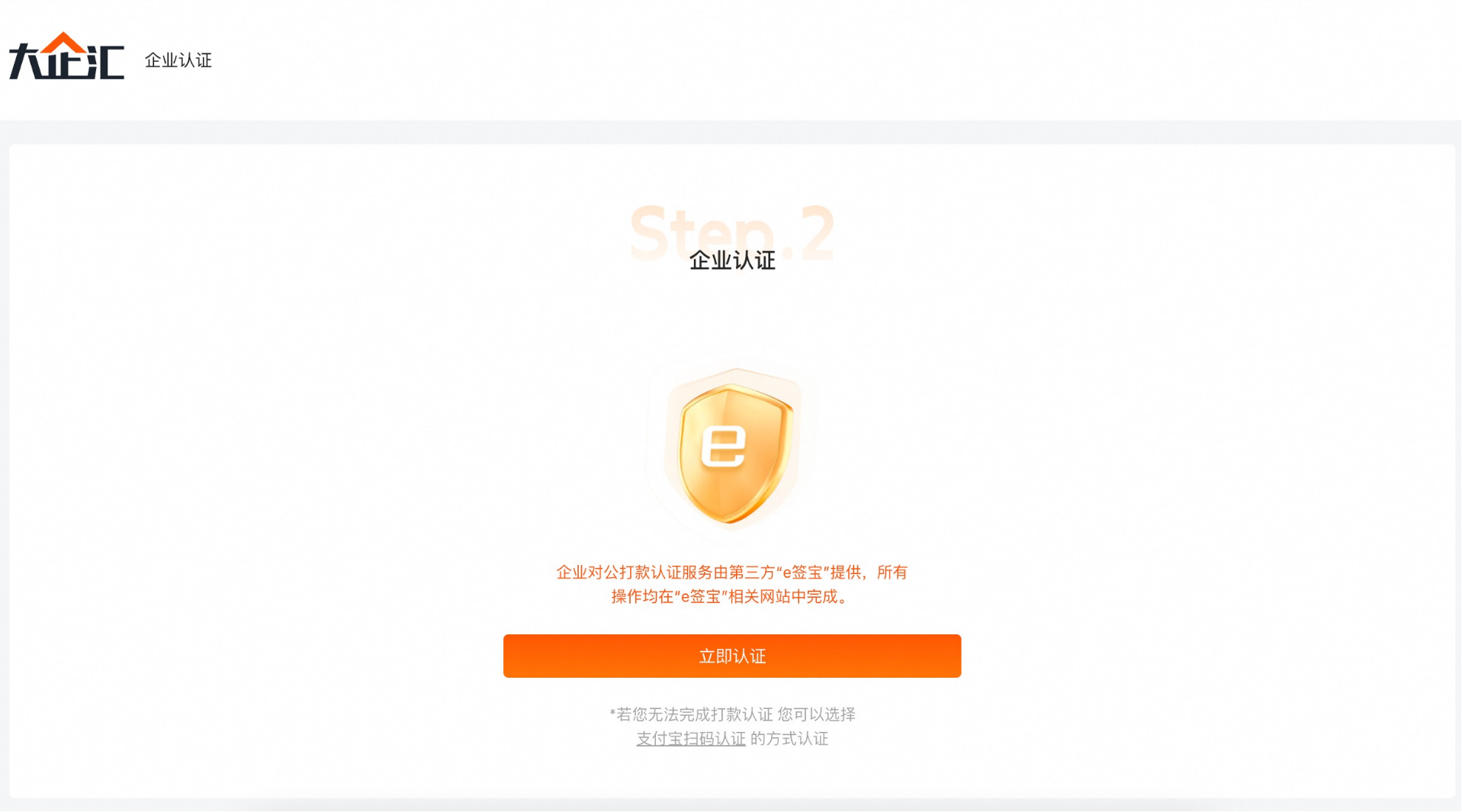 系统提供支付宝扫码认证、企业对公打款认证两种认证方式。