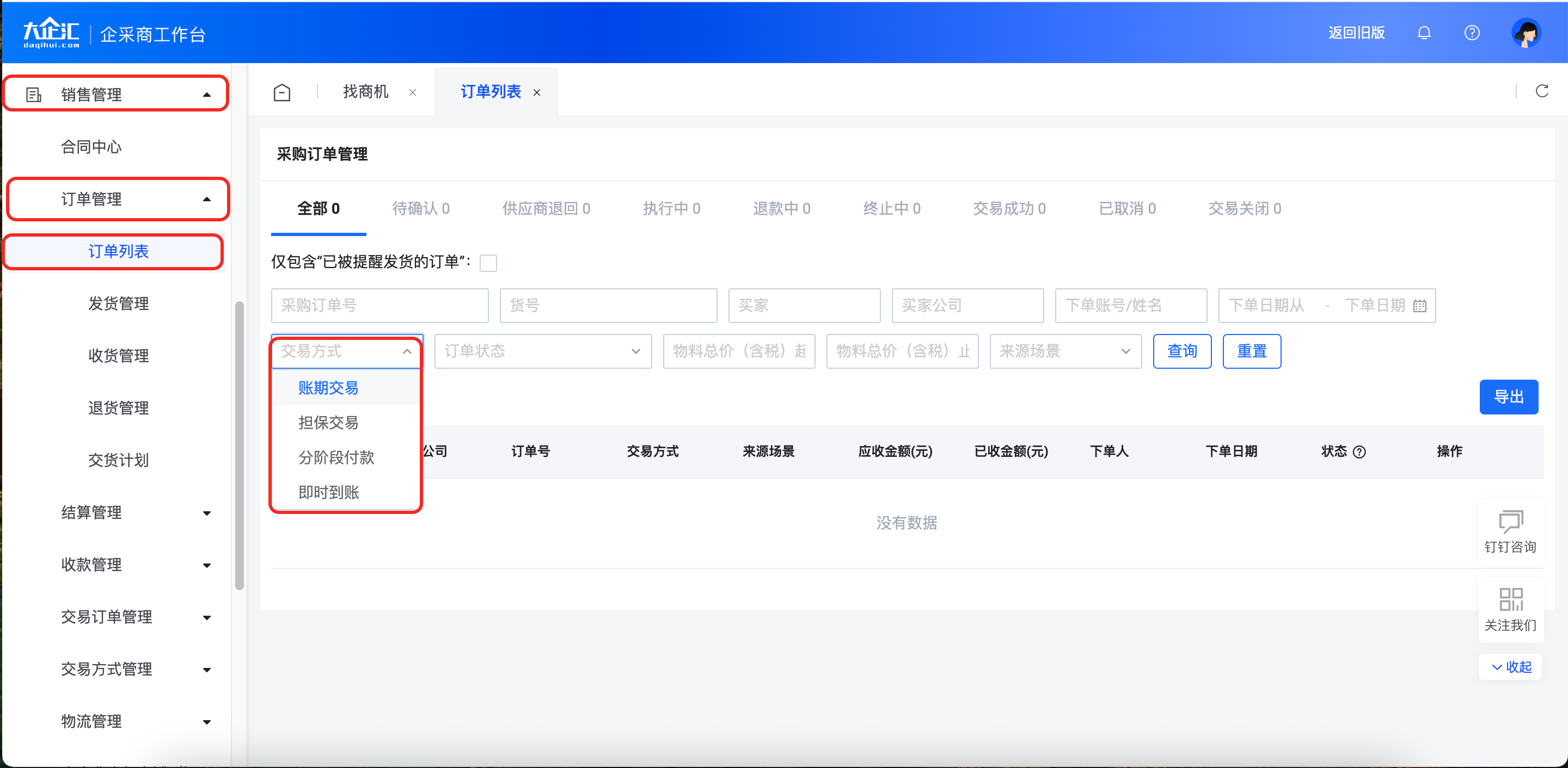 您在进入企采商工作台后,点击【销售管理】-【订单管理】-【订单列表】进入订单页面,通过交易方式的选择可筛选订单。