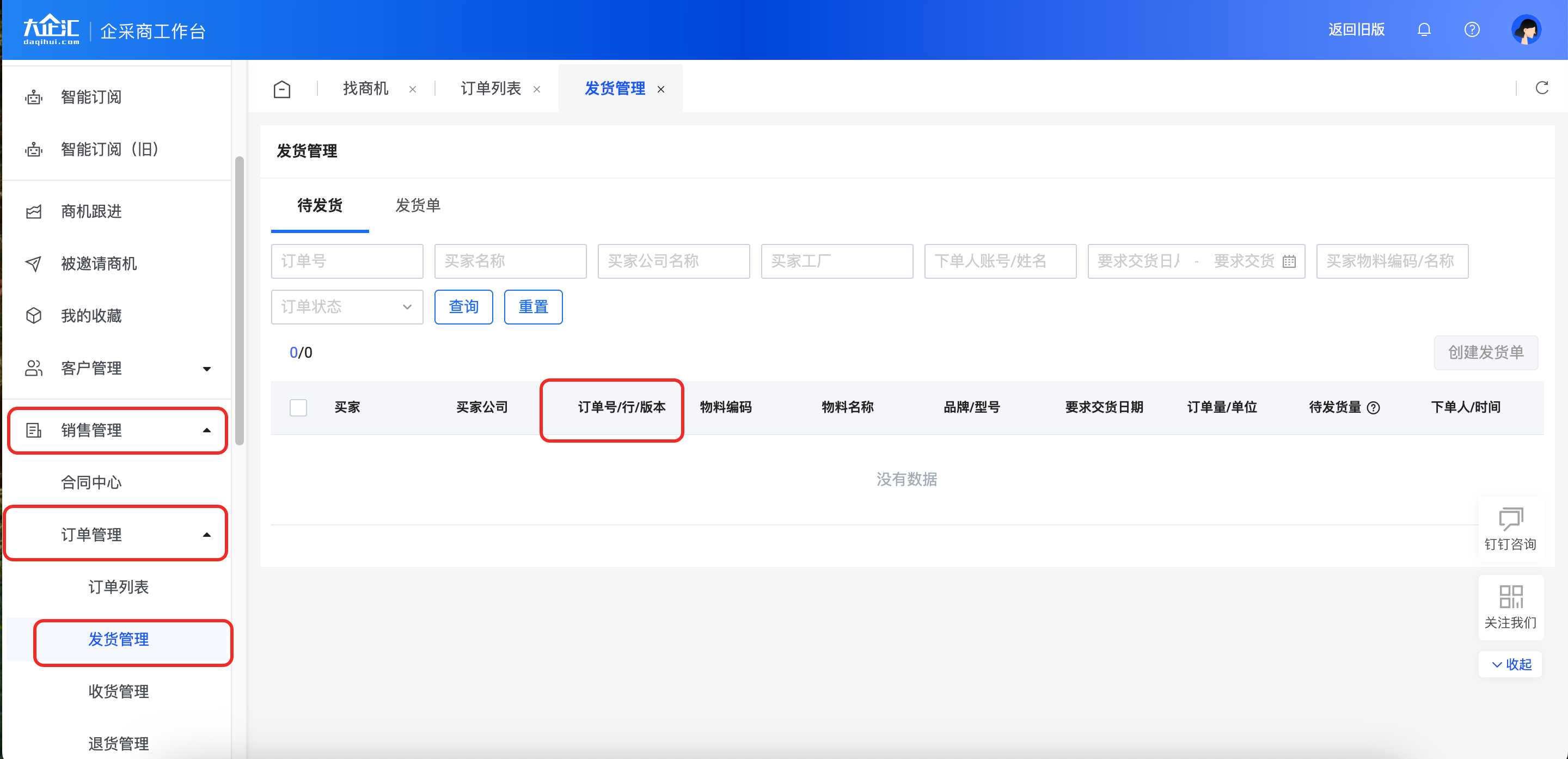 进入企采商工作台,点击【销售管理】-【订单管理】-【发货管理】,可以查看所有待发货的订单行和已创建的发货单状态。在“待发货”页面点订单号链接,进入订单详情页可创建发货。