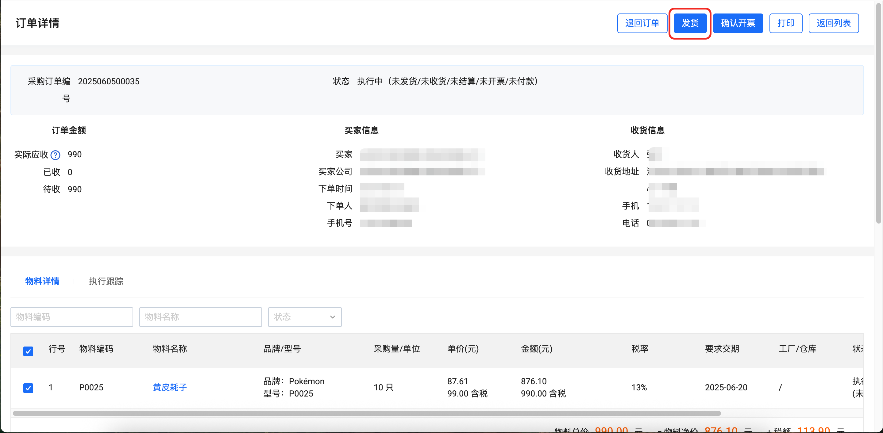 2、账期交易订单:供应商发货、开票-买家收货、收票-账期结算-账期到期后付款;您可进入对应账期交易订单,直接点击右上角发货或者确认开票。