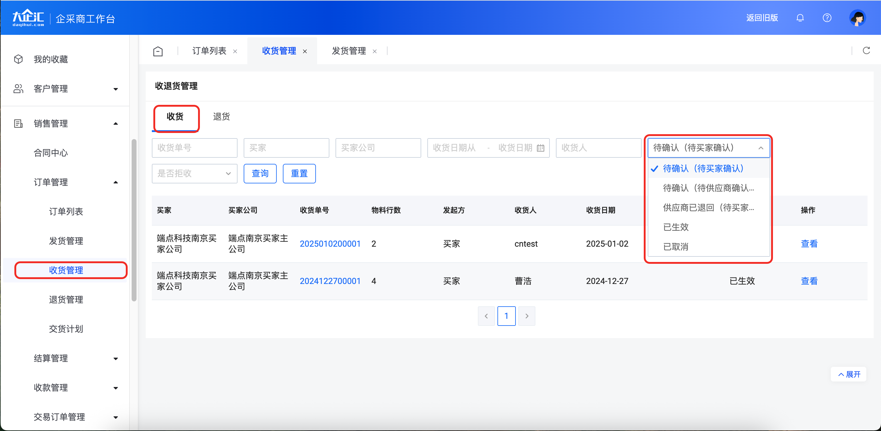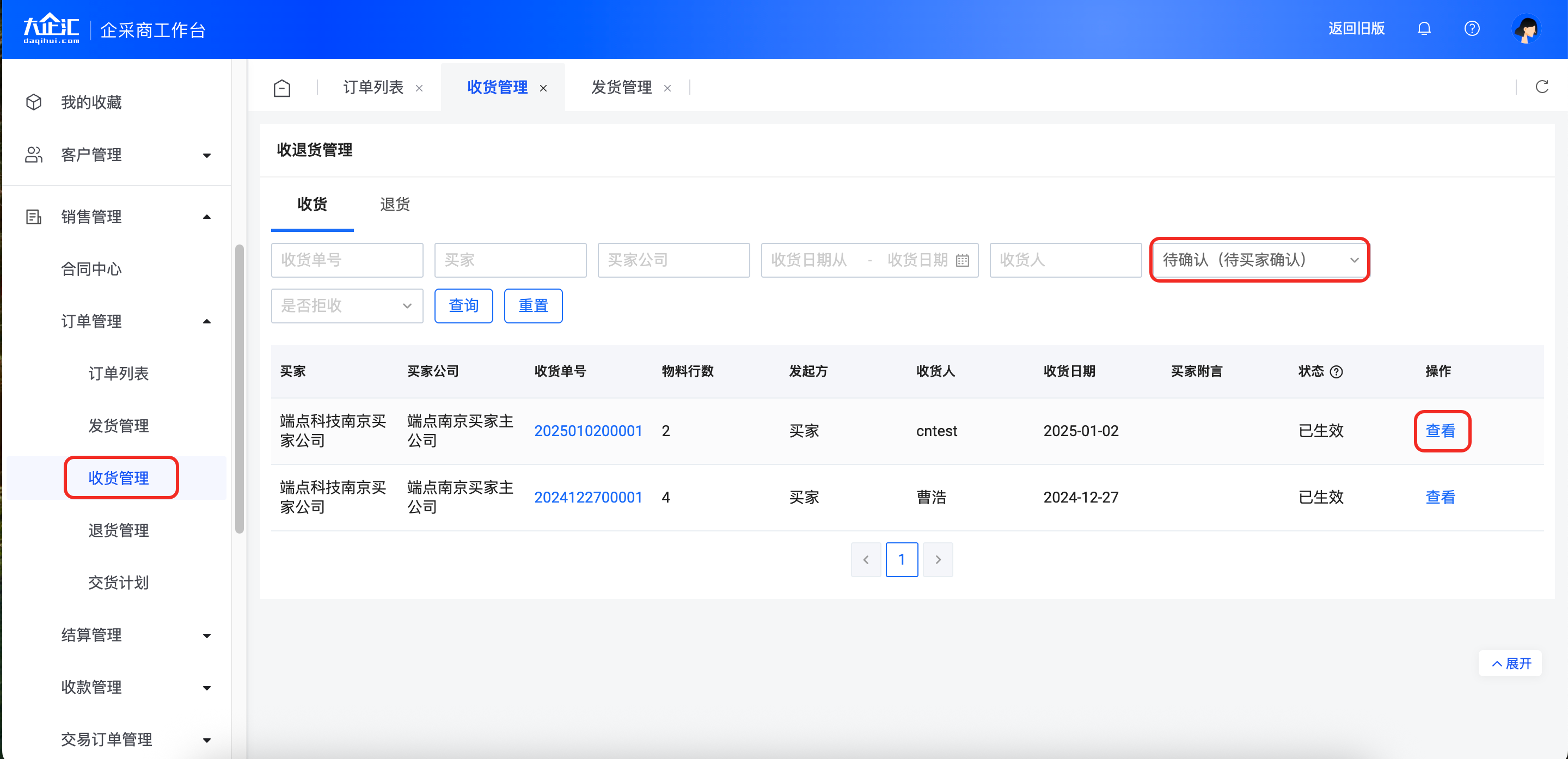 点击【销售管理】-【收货管理】进入收货管理页面,状态栏选择“待确认(待供应商确认)”后点击【查询】。