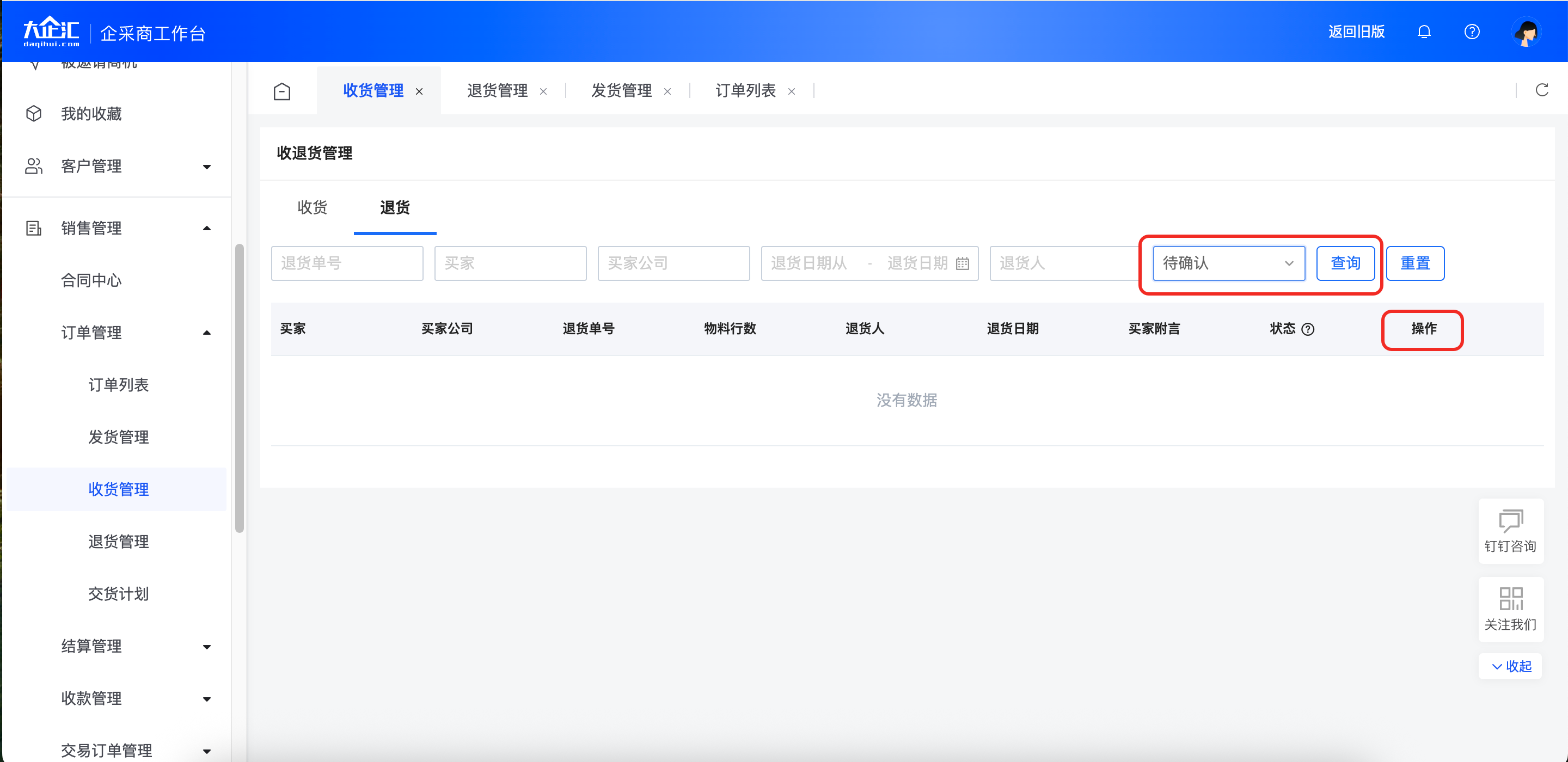 点击“退货”页签,进入退货管理页面,状态选择“待确认”进行查询。