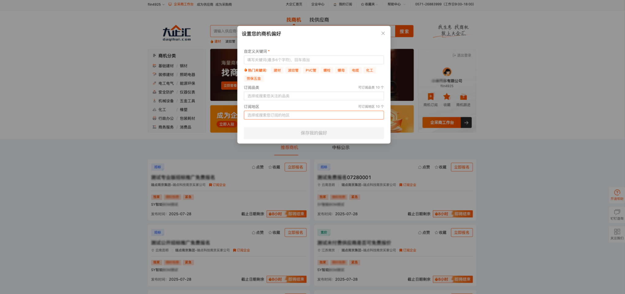 - 用户登录后,首次进入新官网时,会提示您维护商机偏好,您可以按需维护您所希望获取的商机信息,系统将自动为你推荐高质量商机